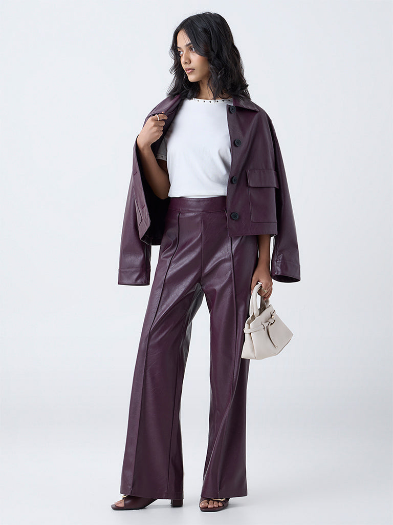 LOV’s burgundy faux leather trousers bring sleek sophistication to seasonal wardrobes. Designed in a high-rise silhouette, they feature a clean waistband with a side zipper for a structured fit. The supple texture and straight-leg cut combine polish with comfort, making them ideal for elevated daywear.