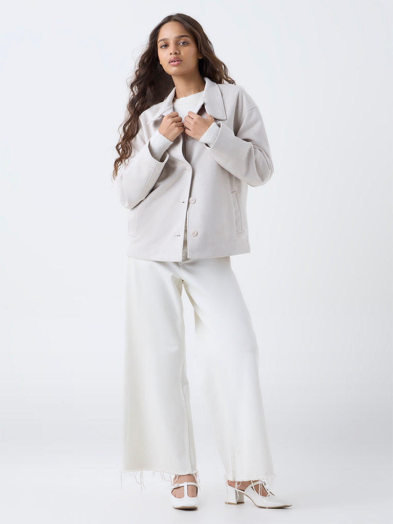 LOV brings this off-white jacket that effortlessly elevates cool-weather dressing. Woven from high-quality suede fabric for lasting warmth and comfort, it’s styled with a high neck, button-up front and full sleeves. Finished with kangaroo pockets, it lends a structured look that’s both functional and stylish.