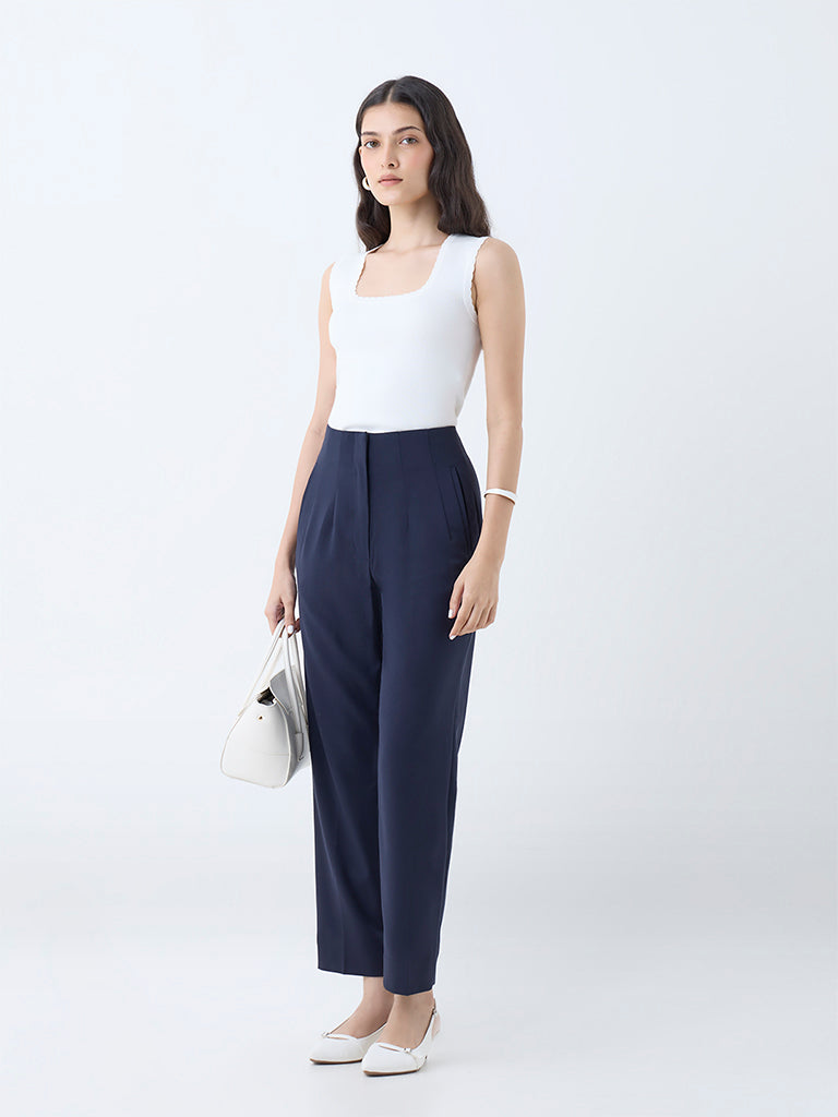 Wardrobe launches these navy trousers as a versatile foundation for polished dressing. Tailored from a lightweight fabric, they are detailed with a hook closure, zip fly and functional side pockets, offering understated elegance with ease.