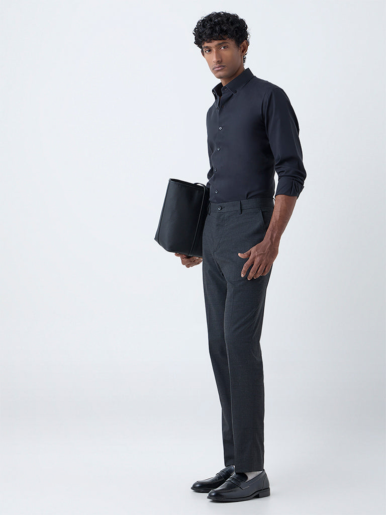 Bring a composed edge to your work wardrobe with this black shirt from WES Formals. Built in a slim-fit silhouette from cotton-rich fabric, it offers a structured yet comfortable feel. Designed with a button-down collar and full sleeves, it’s a reliable choice for a neat, professional look.