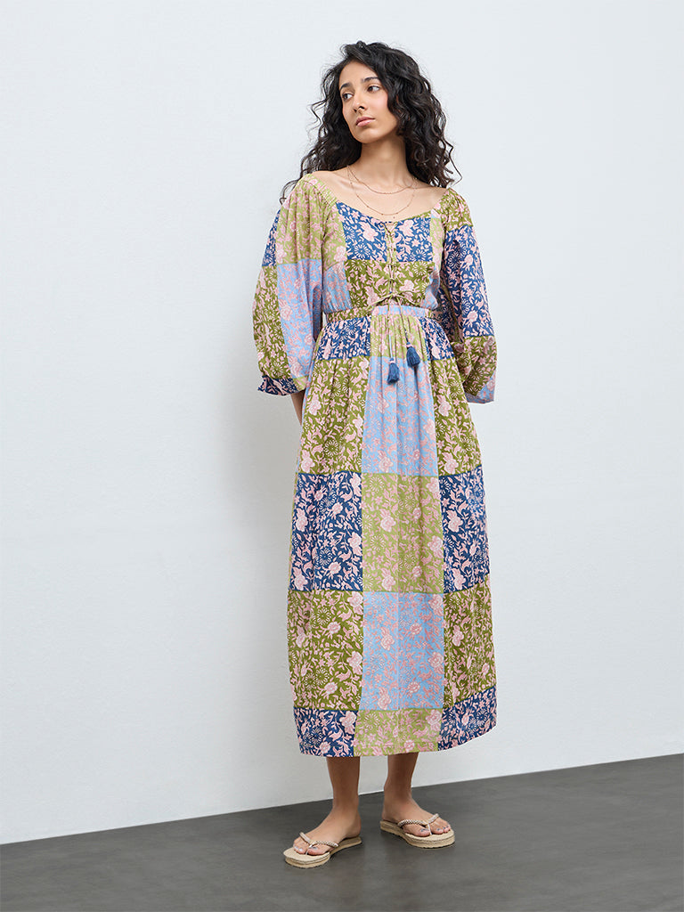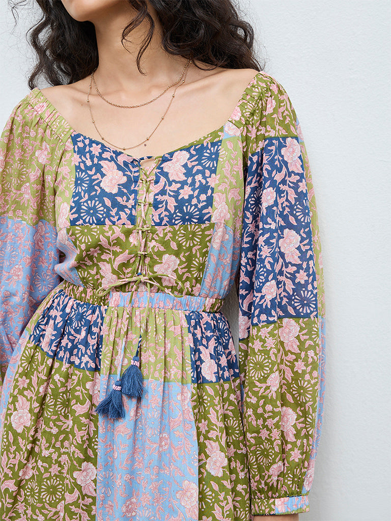 Bombay Paisley launches this vibrant multicolour cotton dress designed to capture carefree holiday moods. Featuring a mix of colourful patchwork detailing with all-over floral prints, it is styled with a V neckline and criss-cross detailing finished with delicate tassels. Puff sleeves and elasticated detailing across the waist enhance the A-line silhouette, making it an easy pick for weekend getaways and resort wear.
