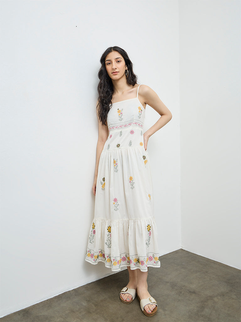 Celebrate timeless elegance in this off-white dress by Bombay Paisley, adorned with delicate floral embroidery. Spun from pure cotton, it is designed in a tiered silhouette with a square neckline and adjustable shoulder straps, offering both structure and ease.