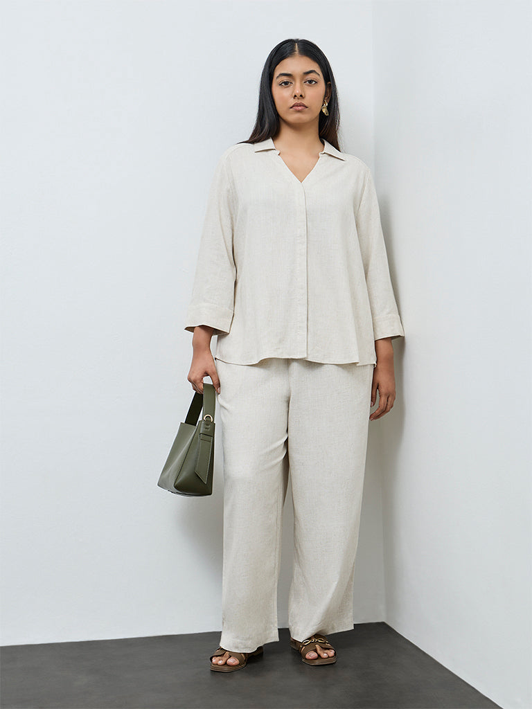 A refined staple for everyday wardrobes, this beige shirt from Gia balances polish with comfort. Crafted from a breathable fabric, it feels light while maintaining a smooth, elevated finish. The notched neckline and concealed button placket create a streamlined front, complemented by three quarter sleeves for relaxed structure.