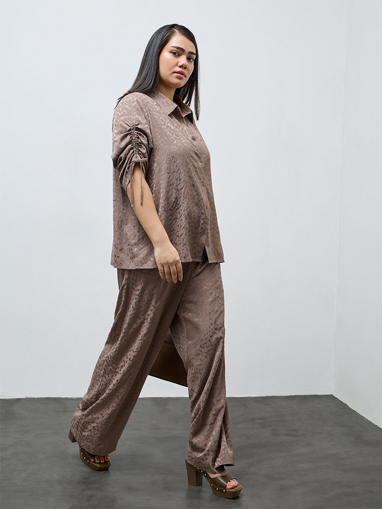 This taupe shirt by Gia is crafted from a subtly self-patterned fabric that adds quiet texture to everyday dressing. A notch collar and three-quarter sleeves with adjustable drawstrings bring a relaxed polish, while the button-up front keeps the silhouette clean and versatile.
