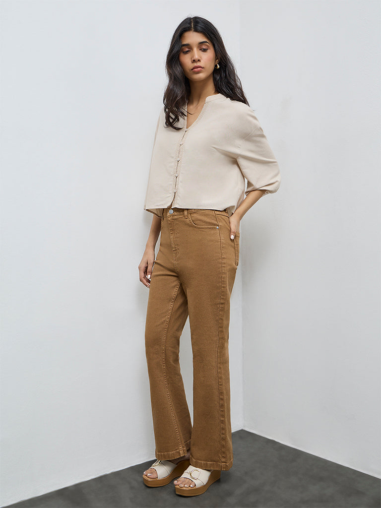 LOV presents this beige blouse with a split neckline extending into a neat button placket, subtly accentuated by a delicate lace design. Bell sleeves are enhanced with delicate lace trims, adding softness to the silhouette. The solid colour of the blouse adds a clean monochrome impact, making it ideal for sleek, subtle styling across everyday and dressier looks.