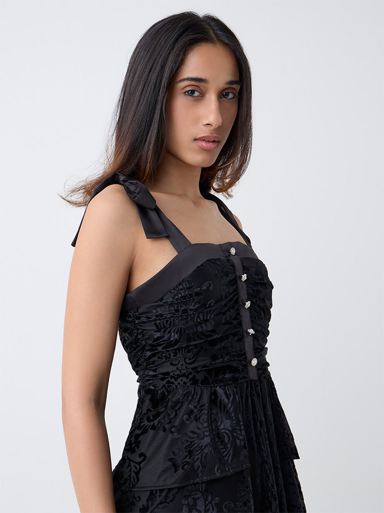 LOV introduces effortless evening glamour with this black velvet dress, enriched with self-patterned floral motifs for subtle texture and depth. The tie-up shoulder straps add a playful elegance, while the ruched bodice and pearl-accented buttons sculpt a sleek, alluring look.