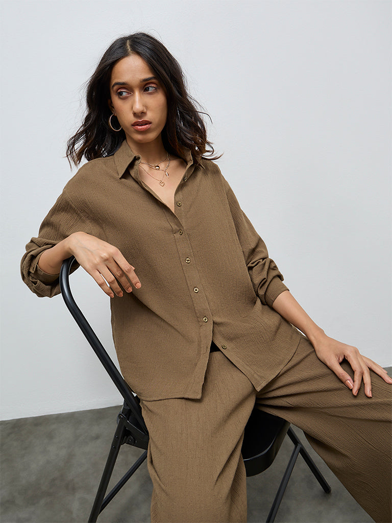 Ground your wardrobe in texture with this brown shirt from LOV, crafted from a self-textured fabric that adds subtle depth. Designed with a classic collar, a button placket, and full sleeves, it delivers understated polish for everyday wear.
