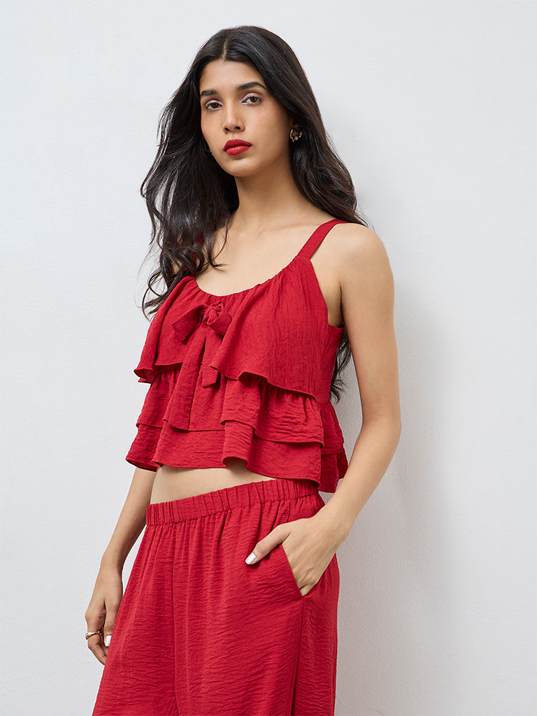 Designed to feel playful without trying too hard, this red top from LOV is crafted from a light, textured fabric with a soft drape. The scoop neckline and sleeveless cut keep the silhouette easy, while the front bow detail adds a feminine touch. Finished with ruffle accents, it’s an effortless pick for casual days or relaxed evenings.