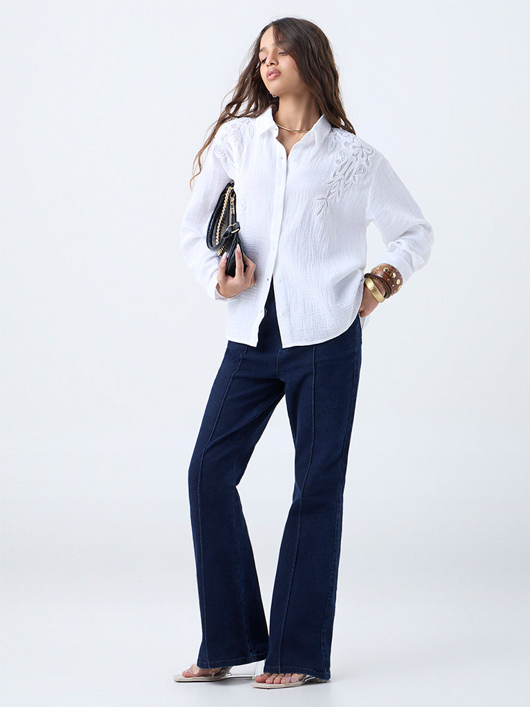 Delicate and refined, this white shirt from LOV is defined by intricate floral embroidery that adds a feminine charm. Crafted from a softly crinkled fabric, it features a classic collar and button placket for structure, while full sleeves bring a graceful finish that transitions effortlessly from day to evening.