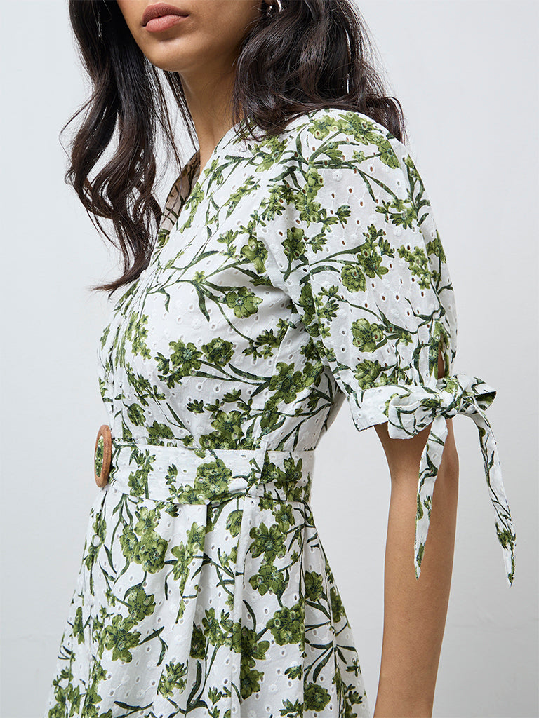 LOV presents this white A-line dress, detailed with subtle green foliage prints for a fresh spring-summer look. A notched V neckline extends into a button placket, complemented by blouson sleeves with tie-up details. Crafted from pure cotton with all-over schiffli embroidered finesse, it is finished with a matching centre belt and buckle for a cinched waist.