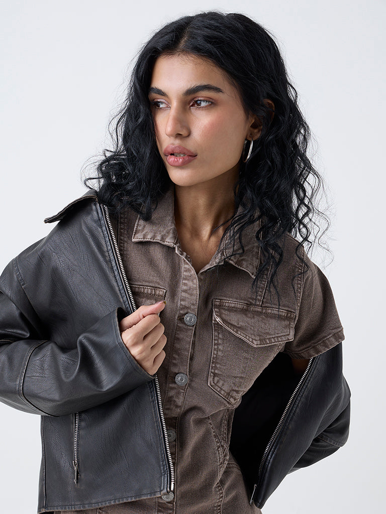Street-style energy defines this brown Nuon denim dress. Cut from a soft cotton-blend fabric, it features a classic collar, short sleeves, flap chest pockets, and bold stitch lines that highlight its utility-inspired attitude.