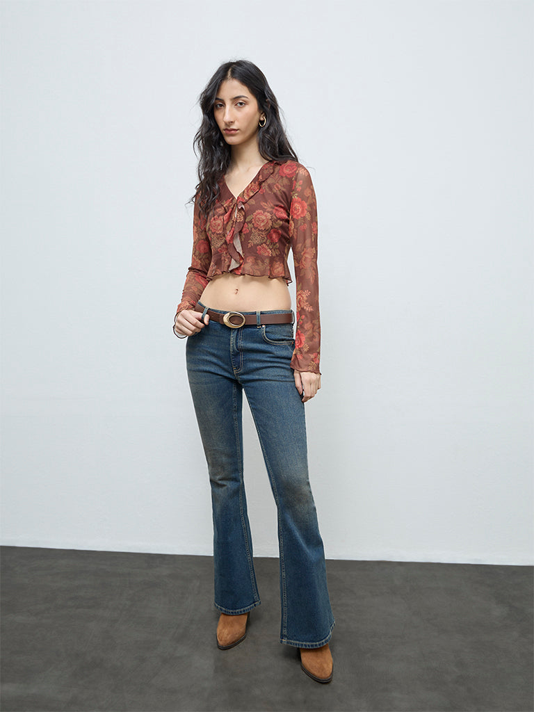 Lean into soft, playful dressing with this brown top from Nuon, adorned with charming floral prints throughout. Cut from lightweight mesh fabric, it features a flattering V-neck and ruffle detailing along the front for added movement. Full sleeves balance the look, making it perfect for café catch-ups, movie nights, or relaxed evenings out.