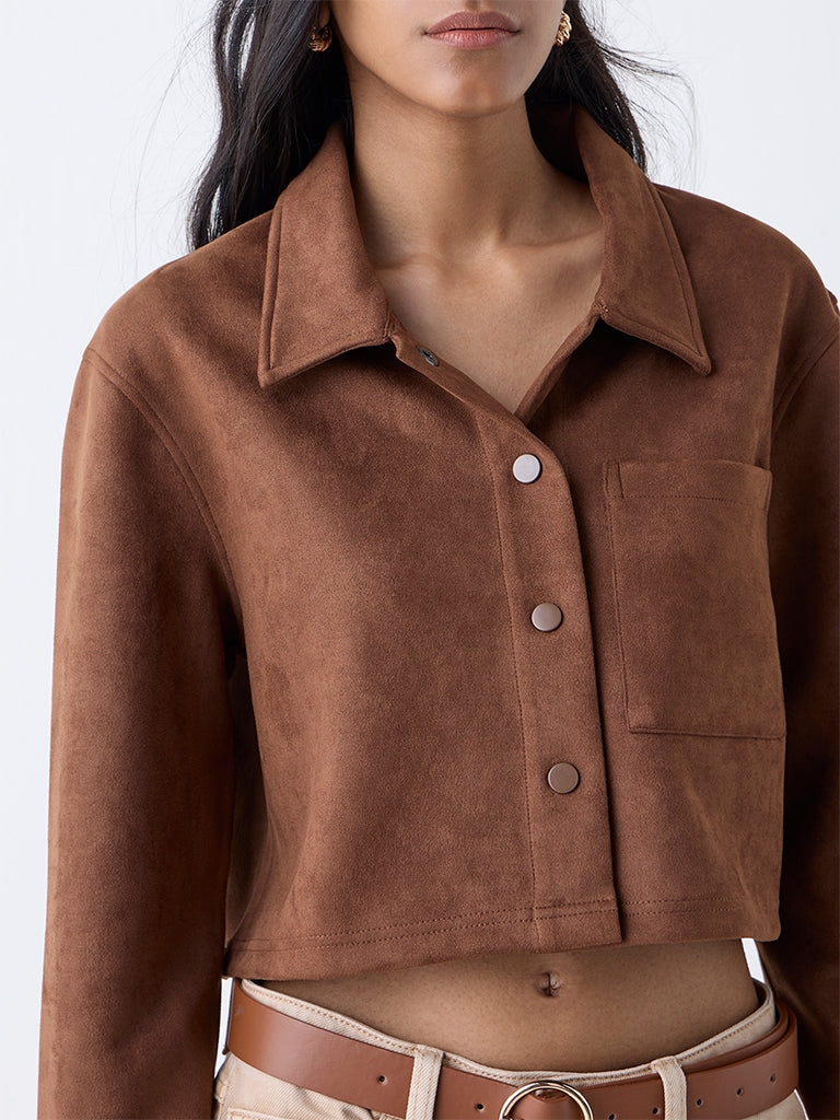 Classic with a modern edge, this brown solid faux suede jacket from Nuon is styled with a spread collar and button-down front for a timeless appeal. Finished with full sleeves and a front pocket, it adds a refined layer to casual and smart-casual ensembles alike.