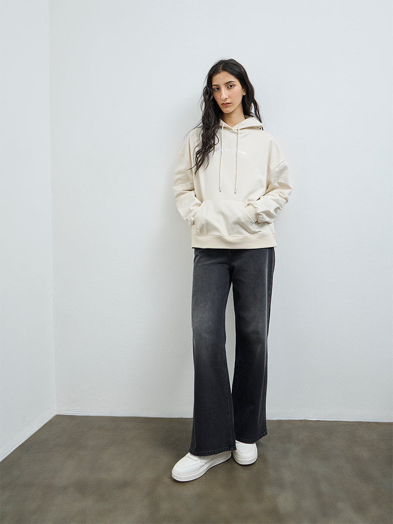 Introducing a relaxed edge to everyday layering, Nuon brings this light beige hoodie made from a cotton-rich fabric delivering cozy warmth and a sumptuous feel. It is designed with an attached hood with drawstrings, drop-down sleeves and kangaroo pockets for a classic finish. Featuring subtle text prints at the front and larger wing-inspired graphic at the back, this jacket works well for casual outings and off-duty styling.