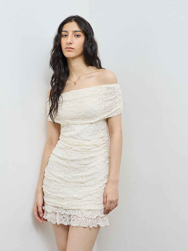 Romantic and statement-led, this off-white dress by Nuon is cut in a bodycon silhouette, carrying an off-shoulder neckline. It showcases a lace-textured surface that adds depth and visual interest. Made from a lightweight fabric, this dress offers ease of movement while maintaining a polished finish, making it well suited for evening outings and dressy occasions.