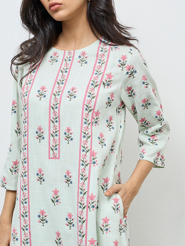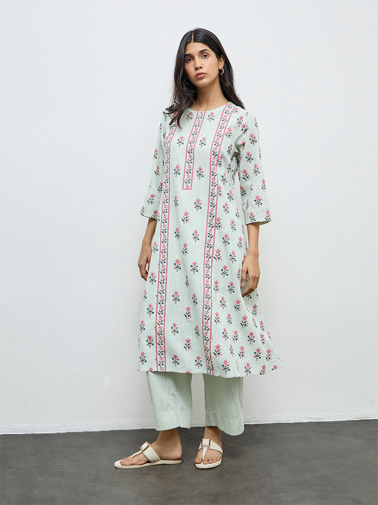 Bloom in effortless elegance with this aqua kurta from Utsa, cut in a flattering A-line silhouette and adorned with vibrant floral motifs. Made from a breathable linen-blend fabric, it features a mandarin neckline, 3/4th sleeves, and a handy slip pocket.