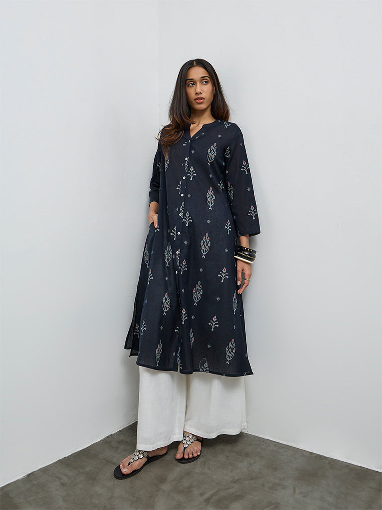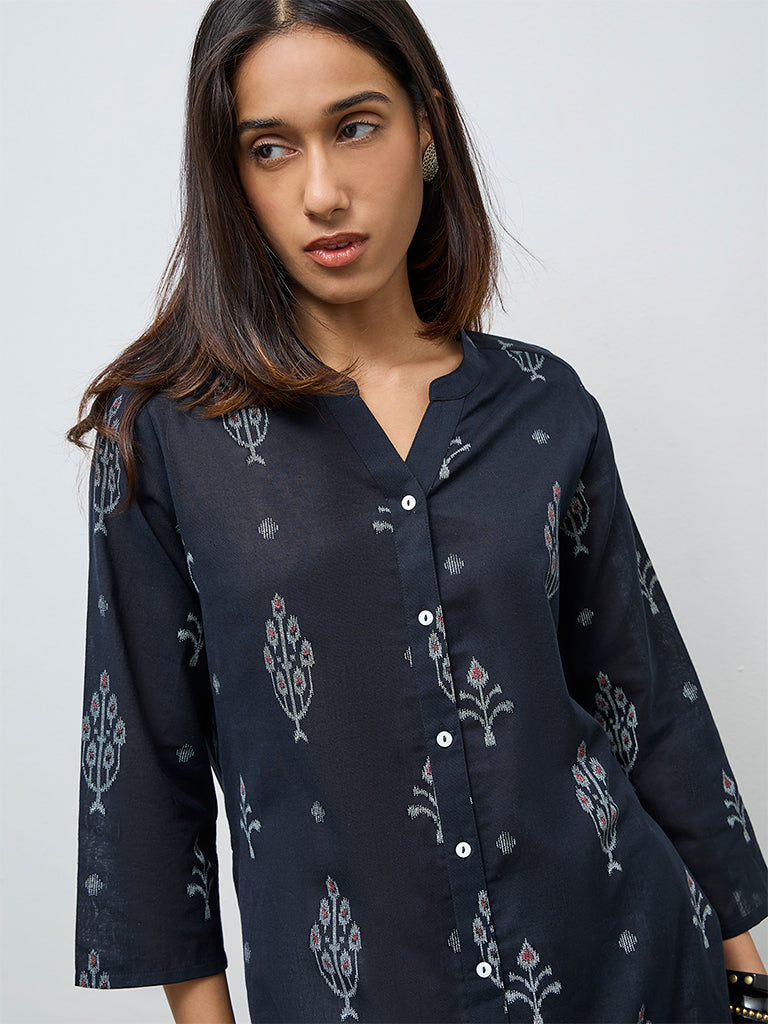 Channel timeless craft with this black kurta from Utsa, adorned with classic ikat prints for a rooted, cultural appeal. Made from a cotton-rich fabric in an A-line silhouette, it is styled with a mandarin neckline, button placket, and 3/4th sleeves, while a slip pocket keeps it practical for festive routines.