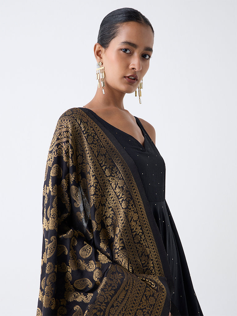 A touch of festive ease defines this black ethnic set by Vark. It is spun in a lightweight fabric that stays comfortable through the day. The kurta is shaped in a flattering A-line silhouette with tiny embellished accents, a V-neck and a sleeveless profile. Matching palazzos feature an elasticated waistband for effortless wear, while a gold-toned embroidered dupatta completes the set with a cohesive finish. Designed to feel light, polished and occasion-ready, it brings an easy charm to celebratory dressing.