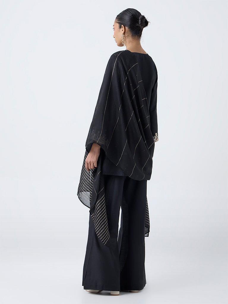 This black ethnic set from Vark strikes a balance between tradition and contemporary style. The kurti features intricate tonal floral embroidery that adds depth and detail, framed by a V-neckline and three-quarter sleeves for a modern touch. Paired with fluid palazzos and a striped dupatta, it brings effortless sophistication to festive dressing.