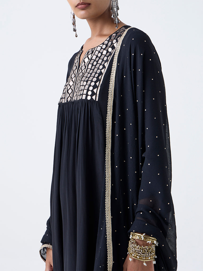 Vark presents a black ethnic set designed in luxurious fabric for a rich, statement-making festive look. The fit-and-flare kurta features a split neckline and three-quarter sleeves, highlighted with intricate mirror-work detailing across the yoke for added brilliance. Solid palazzos with an elasticated waist ensure comfort without compromising style. The soft dupatta, finished with badla embroidery and a shimmering zari border, ties the look together with impeccable festive finesse.