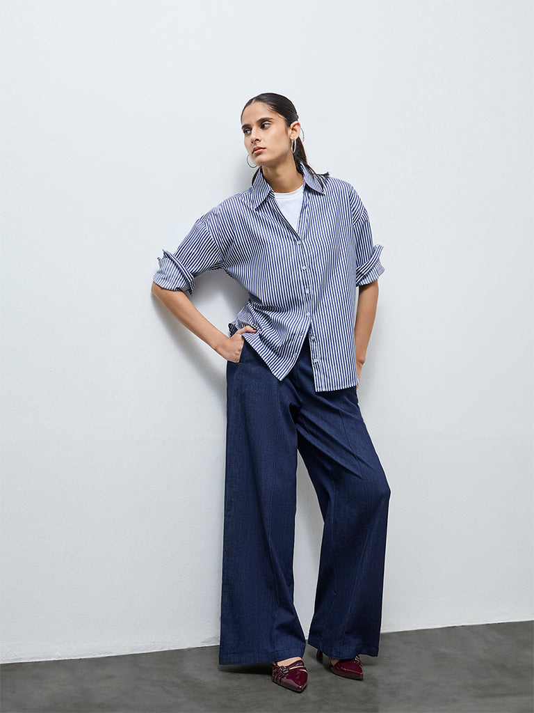 Turn to this navy striped blouse from Wardrobe for effortless on-the-go dressing. The soft, breathable fabric built provides sumptuous comfort for long wear hours while the ribbed texture shapes a form fitted silhouette. It is framed with a boat neck and short sleeves, making it an easy choice for streamlined everyday styling.