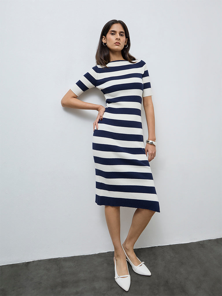 A sophisticated staple, this dress from Wardrobe features bold navy stripes on a bodycon silhouette. It is framed with a boat neck, short sleeves and a slit on the side for easy movement. The soft, breathable fabric construction is finished with a ribbed base, resulting in a form fitted look and delivering a soft feel for day-long wear.