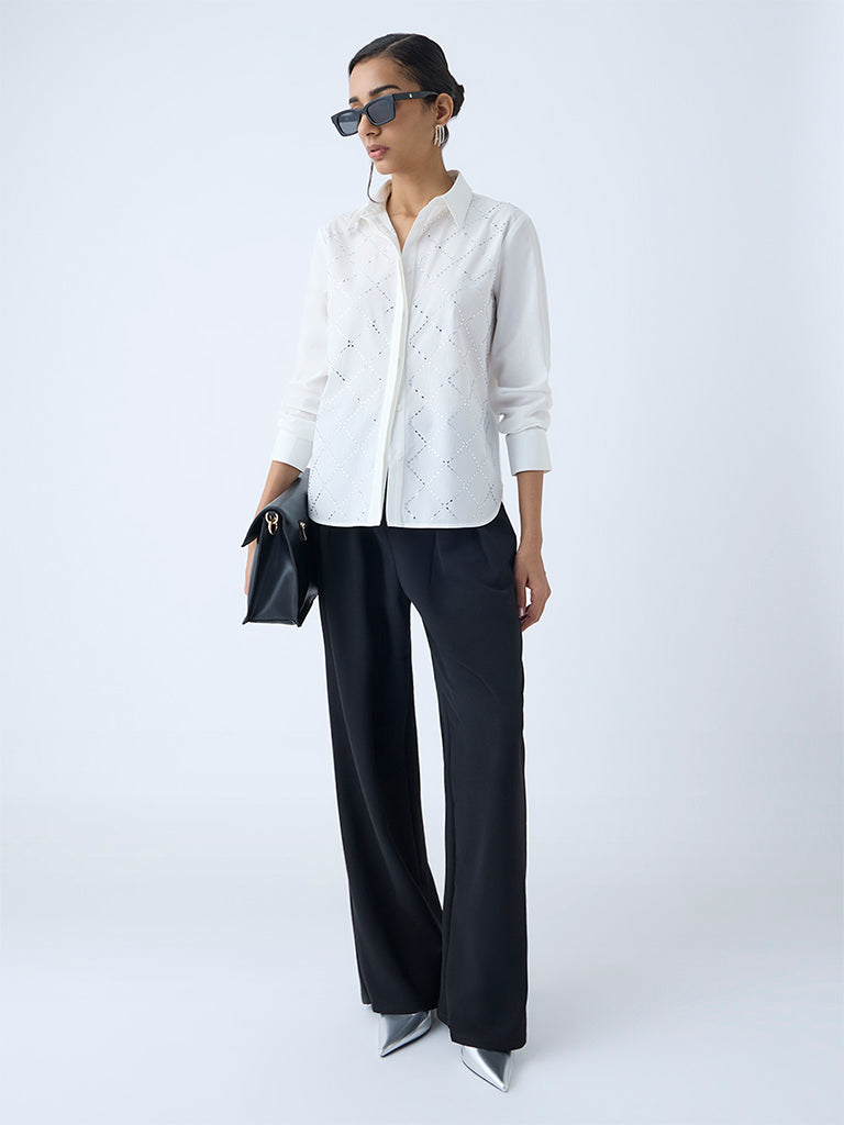 A study in understated sophistication, this white cotton shirt from Wardrobe is embellished with delicate diamanté accents for a touch of quiet glamour. Designed with a spread collar and a concealed button placket, it offers a seamless finish. Full sleeves and precise tailoring lend structure, making it a versatile choice that transitions effortlessly from boardroom to after-hours engagements.