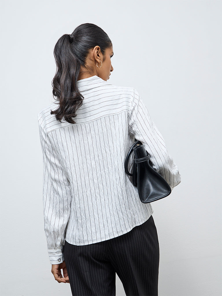 A smart update to everyday basics, this white blouse from Wardrobe is detailed with stripe prints that lend a classic appeal. Crafted from a high-quality fabric blend, it offers an easy feel for regular wear. Designed with a V-neck and full sleeves, this is a suitable pick for relaxed yet put-together looks.