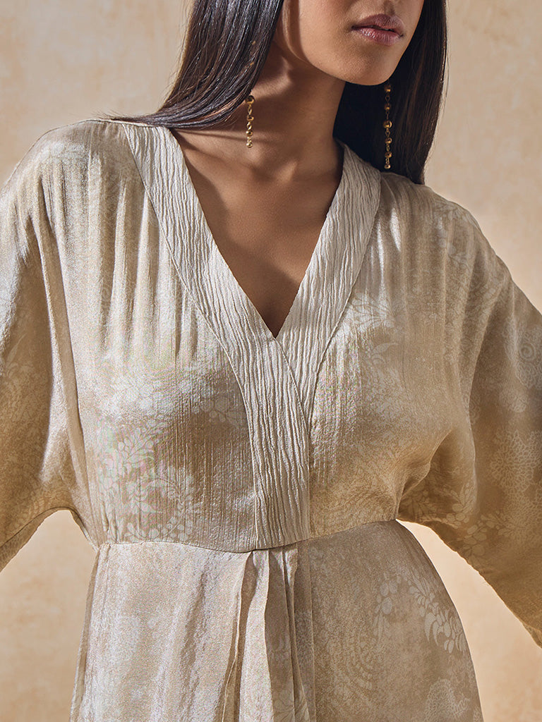 Flowing with quiet drama, this beige dress is cut with a plunging V-neckline and framed by relaxed kimono sleeves. The textured detailing at the bodice draws the eye, while soft pleats release into a floor-grazing silhouette that moves with ease. A natural choice for golden-hour soirées and evening celebrations where elegance feels effortless.