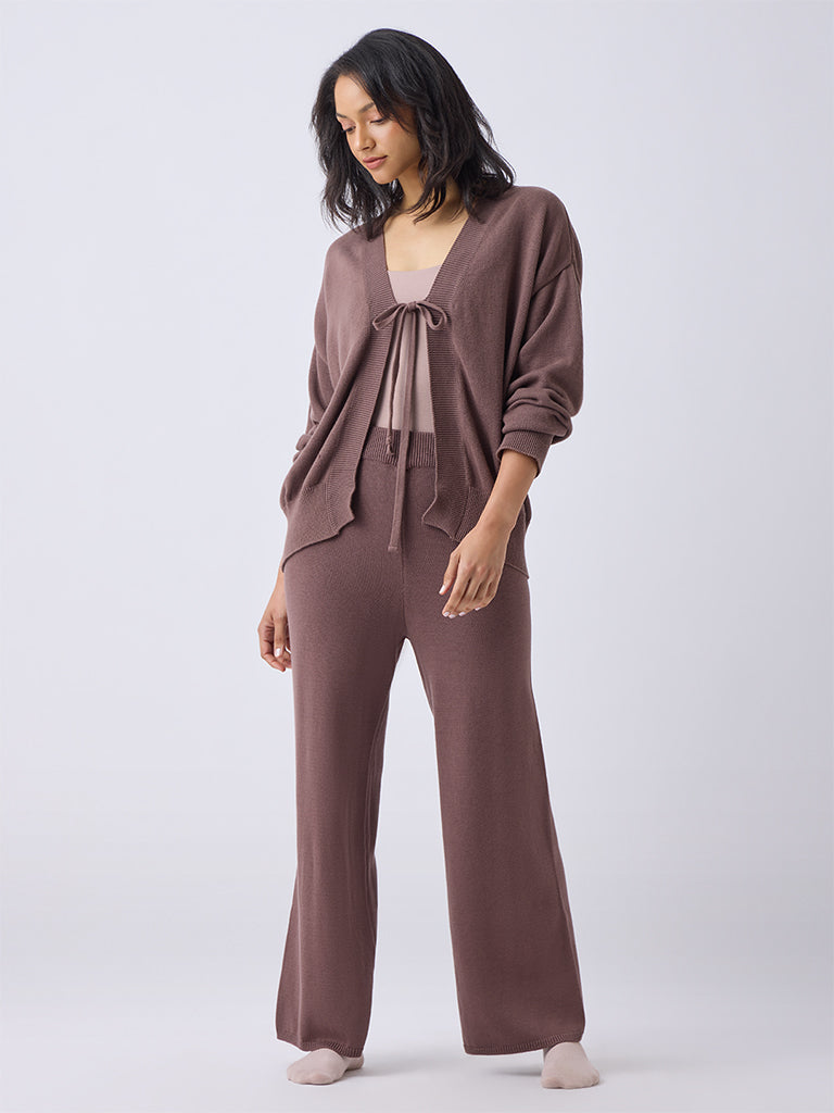 This brown tie-up cardigan from Wunderlove brings ease and light structure to everyday styling. The V-neckline draws attention to the soft tie-up detail at the front, while drop-shoulder sleeves create a laid-back outline. Finished in a smooth knit with ribbed edges for subtle definition, it layers beautifully over camisoles and tees.