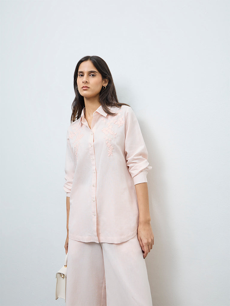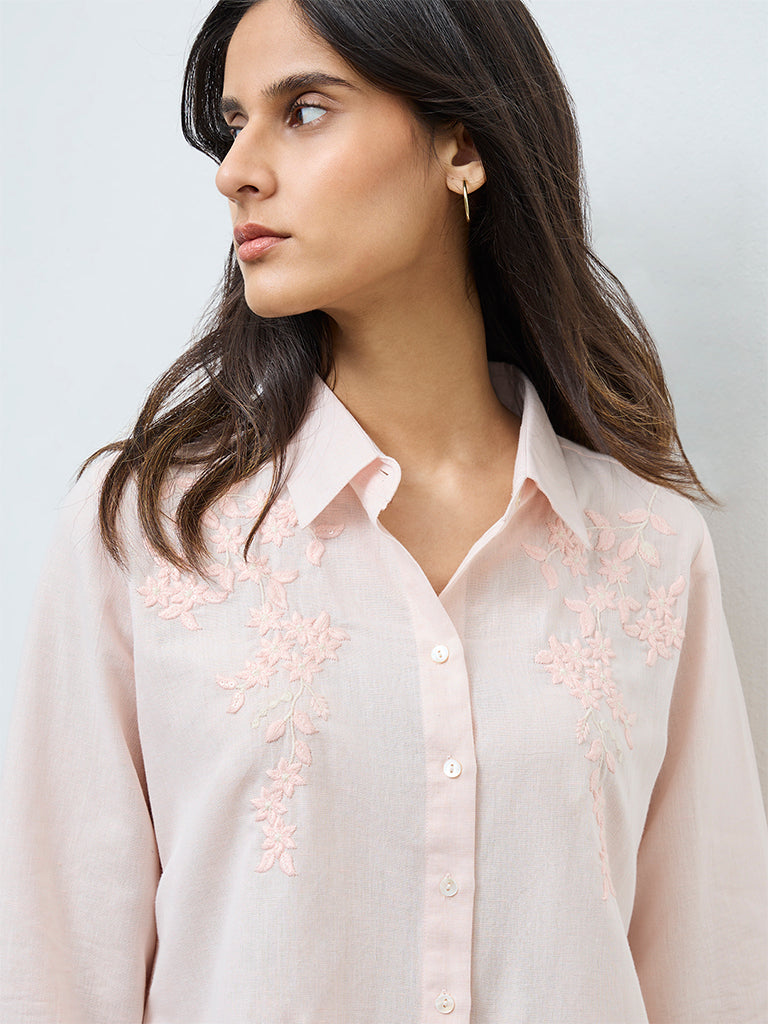 Designed for easy everyday styling, this pink tunic from Zuba features floral embroidery that adds soft visual interest. Styled with a crisp collar, a buttoned front and full sleeves, it is woven from cotton-blend fabric that lends a smooth feel and lasting comfort through the day. Suitable for pairing with trousers or palazzos for both casual and dressed-up looks.