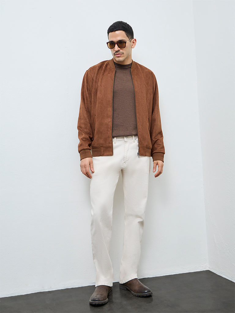 Layering takes on a refined edge with the brown jacket from Ascot. Structure in a relaxed fit, it features a mock collar, a zipper front, full sleeves, and envelope pockets for a clean, structured look. Milled from a premium-blend fabric with a suede finish, it offers a smooth hand feel suited for cooler days and elevated casual styling.