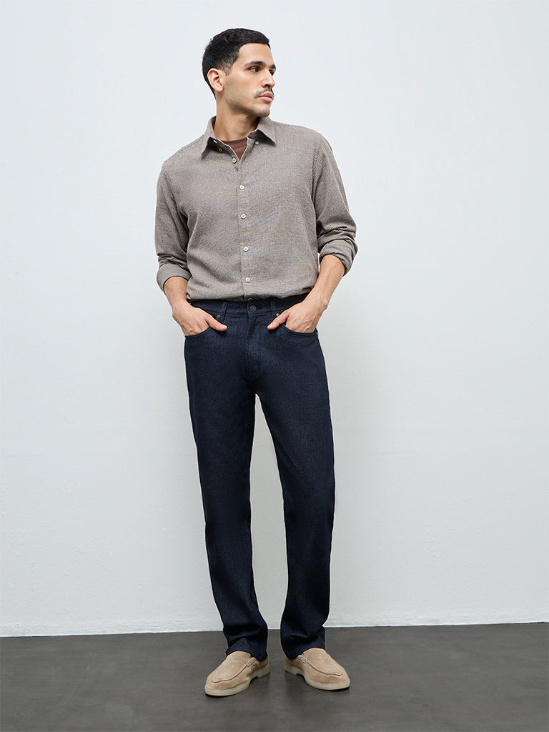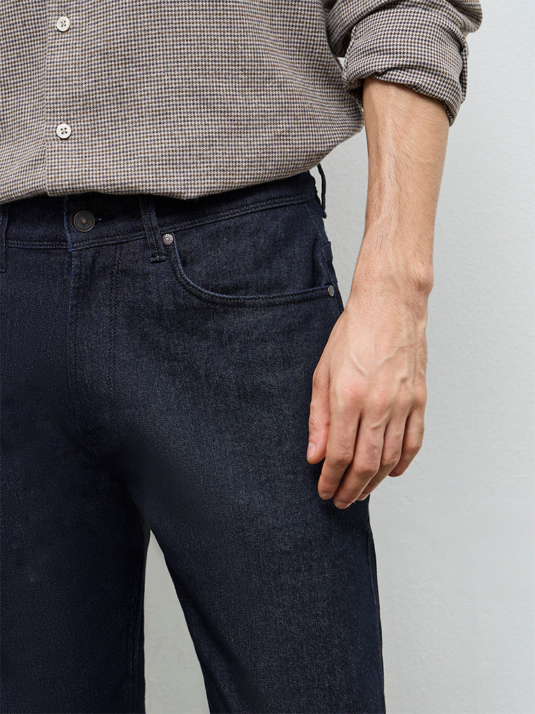Cut with an easy silhouette, these dark blue jeans from Ascot feature a mid-rise profile and a relaxed fit. Designed with a buttoned waist, zipper fly, belt loops and multiple pockets, they offer practical structure for daily wear. Crafted from a durable cotton-blend fabric, the finish feels sturdy yet comfortable.