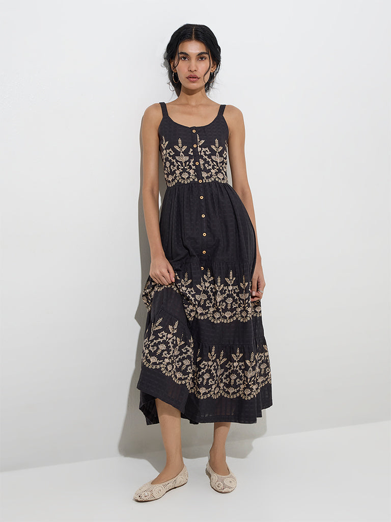 This black tiered dress from Bombay Paisley blends elegance with effortless style. Crafted from pure cotton, it features a self-checkered design with delicate embroidery for a refined touch. The sleeveless silhouette, round neck, and button-down front enhance its timeless appeal, making it perfect for any occasion.
