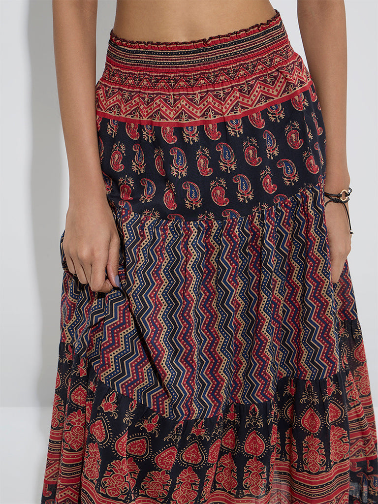 This black skirt from Bombay Paisley is adorned with intricate paisley motifs and chevron patterns. Crafted from a cotton-rich fabric, it features a smocked waistband for a comfortable fit. Finished with side pockets, this piece combines style and practicality effortlessly.