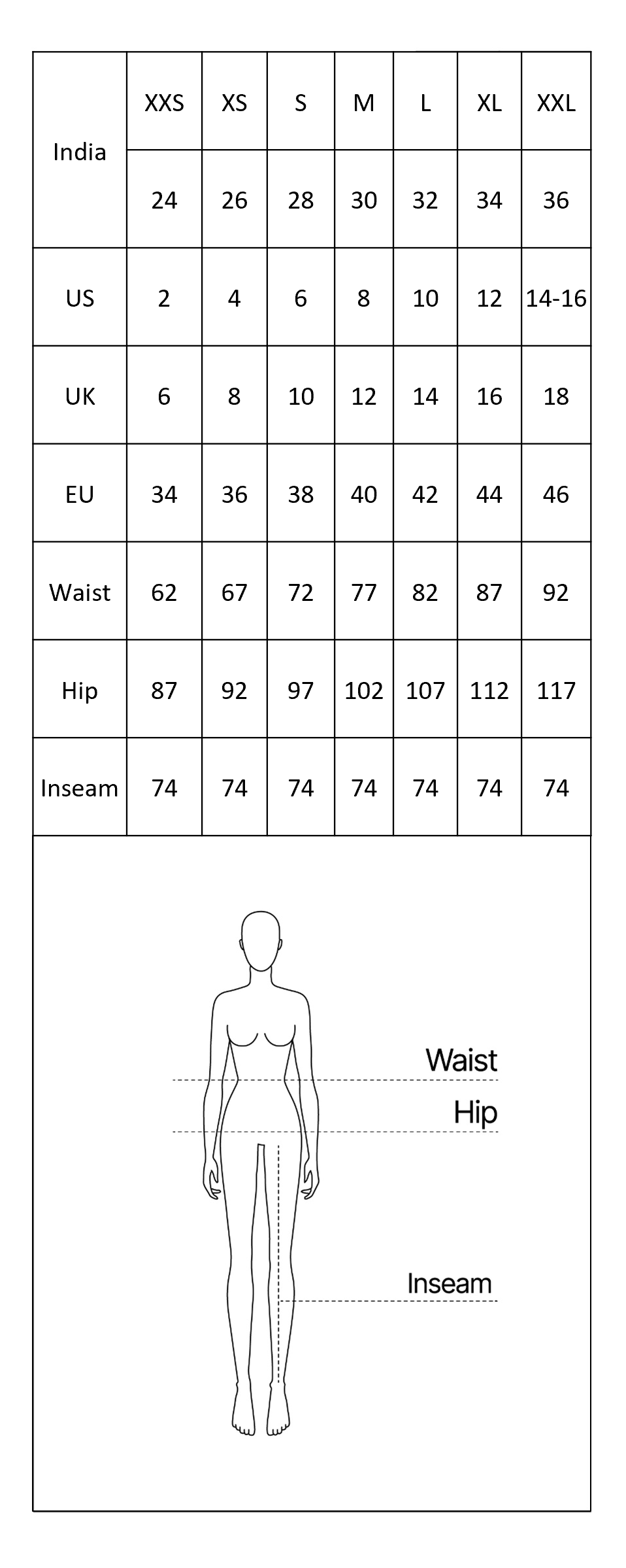 | Size | Waist | Hip | Inseam |