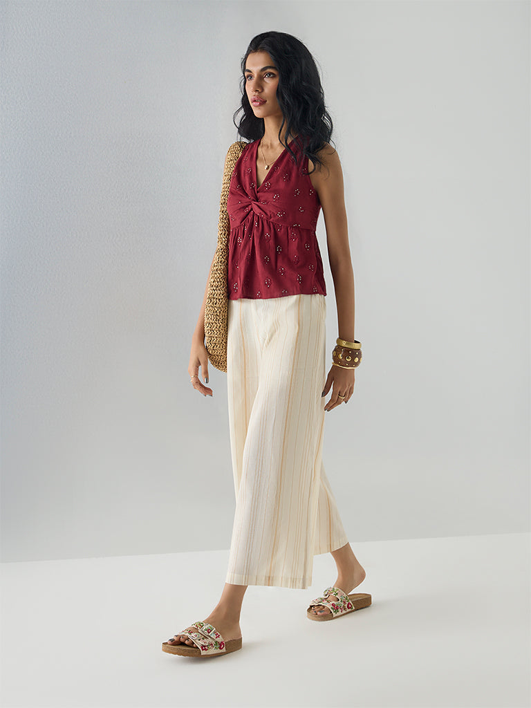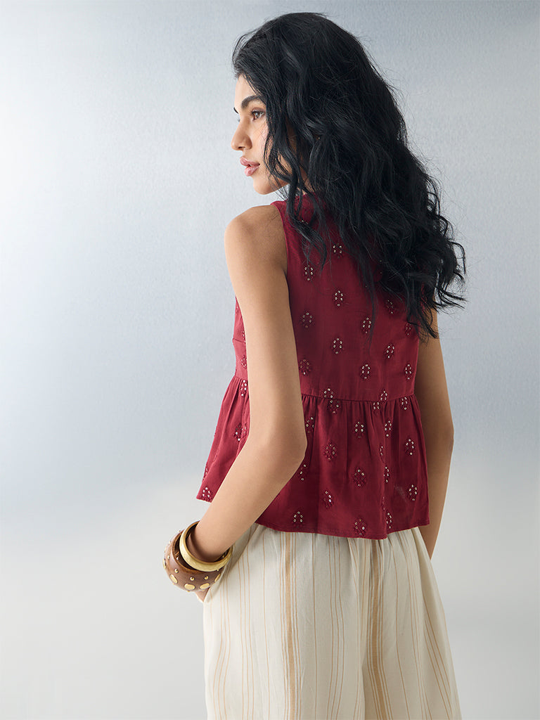 For evenings that call for effortless allure, this red top from Bombay Paisley takes center stage. Sequins glimmer subtly across breathable cotton, catching light with every movement, while a knotted bust and sleeveless silhouette create a contemporary shape. Perfectly poised between playful charm and modern elegance, it pairs seamlessly with high-waist skirts or tailored trousers.