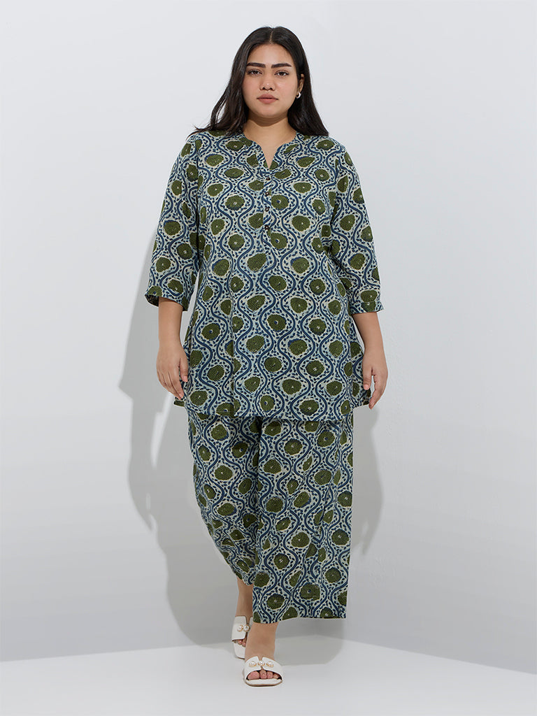 This green ethnic tunic from Diza spotlights floral designs for a contemporary finish. Spun from a lightweight fabric, it features a mandarin neck that flows into a quarter button placket and three-quarter sleeves for a structured appeal.