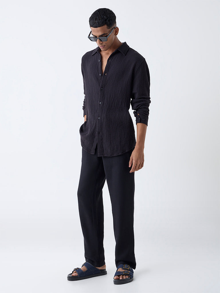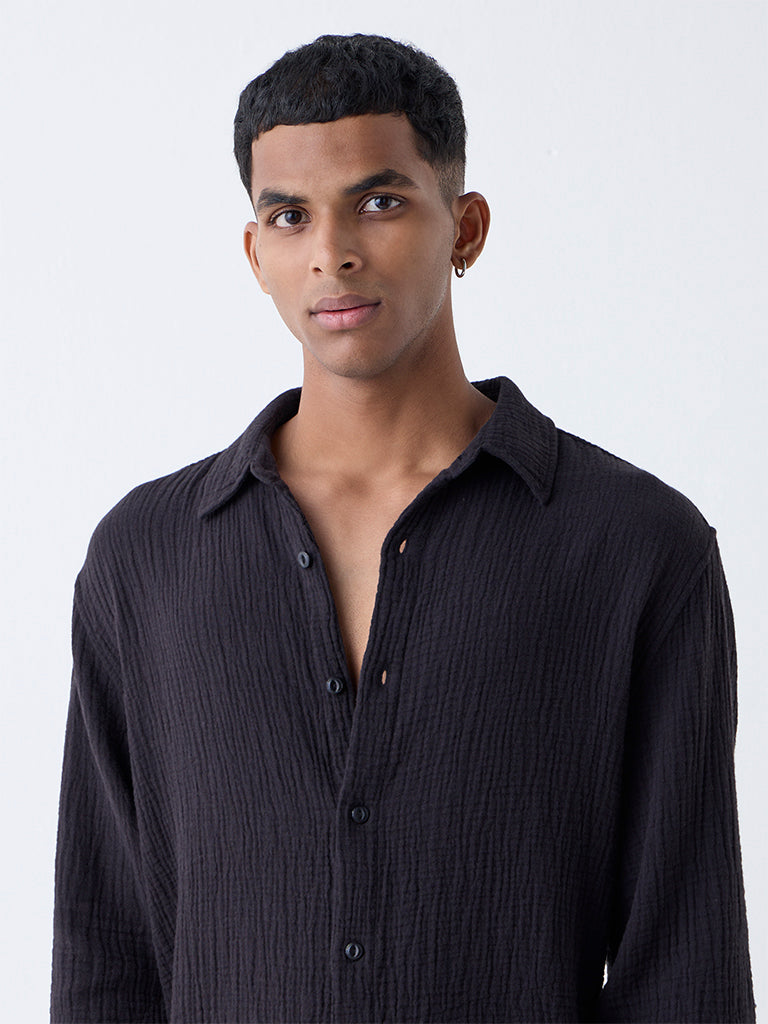 Laid-back yet distinctive, this black shirt from ETA is cut from breathable cotton with a naturally crinkled texture. Designed in a relaxed fit with a spread collar, full sleeves and button-down front, it channels casual ease with a modern finish, making it a versatile staple for resort-inspired styling.