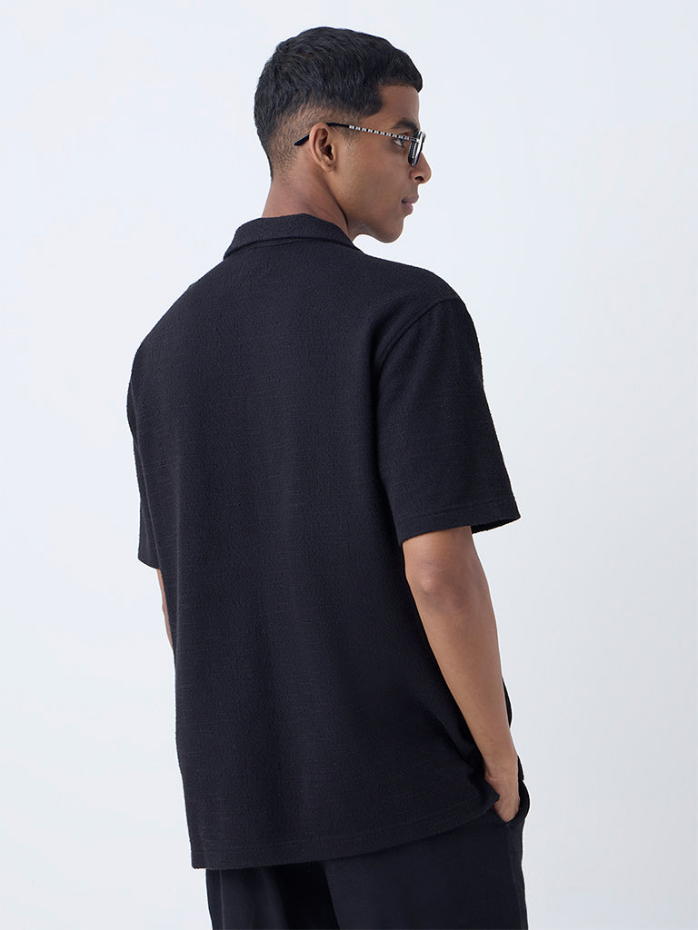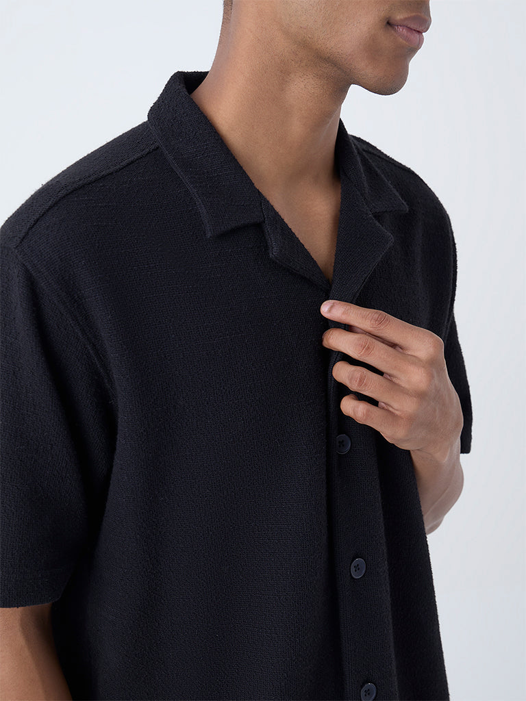 This black shirt from ETA is milled from cotton-blend fabric with a textured surface for a tactile feel. It is framed with a notched collar, a button placket and short sleeves for refined structure. Carved in a relaxed form,