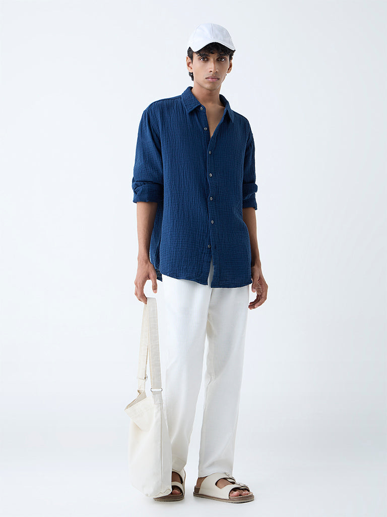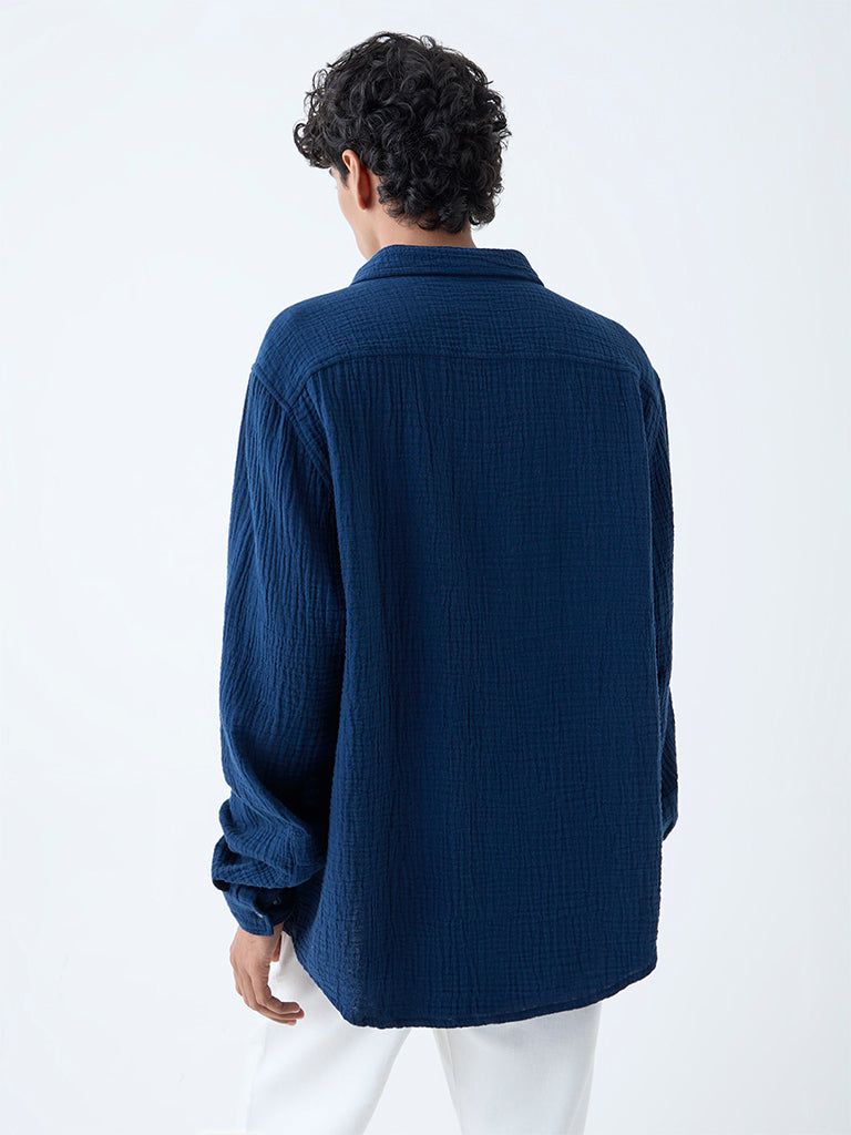 Ideal for off-duty days, this indigo shirt by ETA pairs tactile texture with effortless style. Milled from pure cotton with a naturally crinkled finish, it’s cut in a relaxed fit that ensures breathable comfort. A structured collar leads into a button placket, while full sleeves complete its easy-going look.
