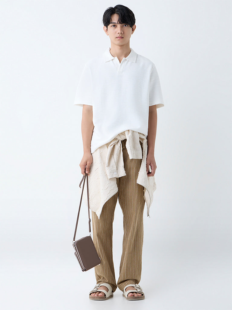 Redefine your wardrobe staples with this white polo t-shirt from ETA. Woven from a self-textured fabric, it offers breathable comfort in a breezy relaxed profile. The spread collar lends a refined edge, while the short sleeves keep the look casual yet elevated.