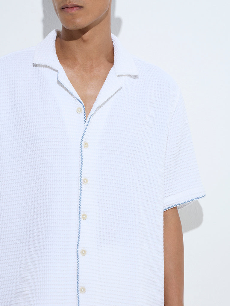 ETA presents this white shirt, woven with a refined waffle texture for a modern touch. Crafted from a cotton-rich blend, this relaxed-fit essential is designed with a classic camp collar, a button-up front, and half sleeves, making it a versatile addition to your wardrobe.