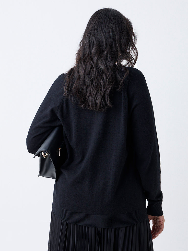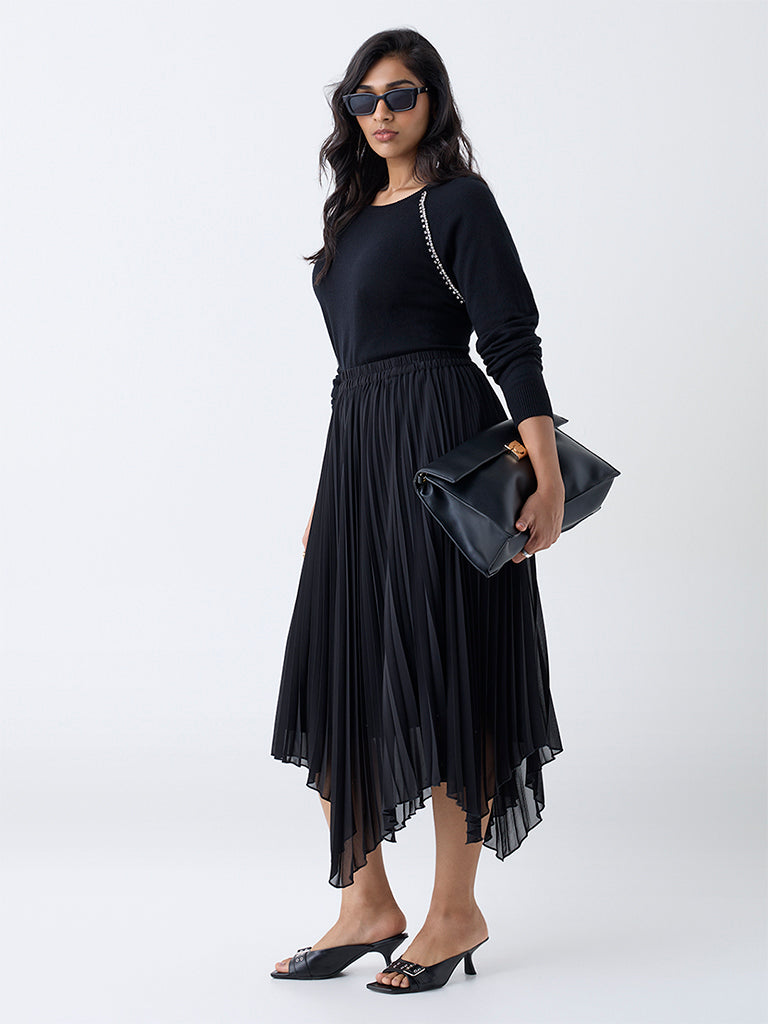 This black sweater from Gia is adorned with diamante embellishments that adds shimmer to its classic appeal. Designed with a round neck and full sleeves, it offers a clean, timeless look. Made from soft, sumptuous fabric, it ensures a comfortable and elegant wear through the season.