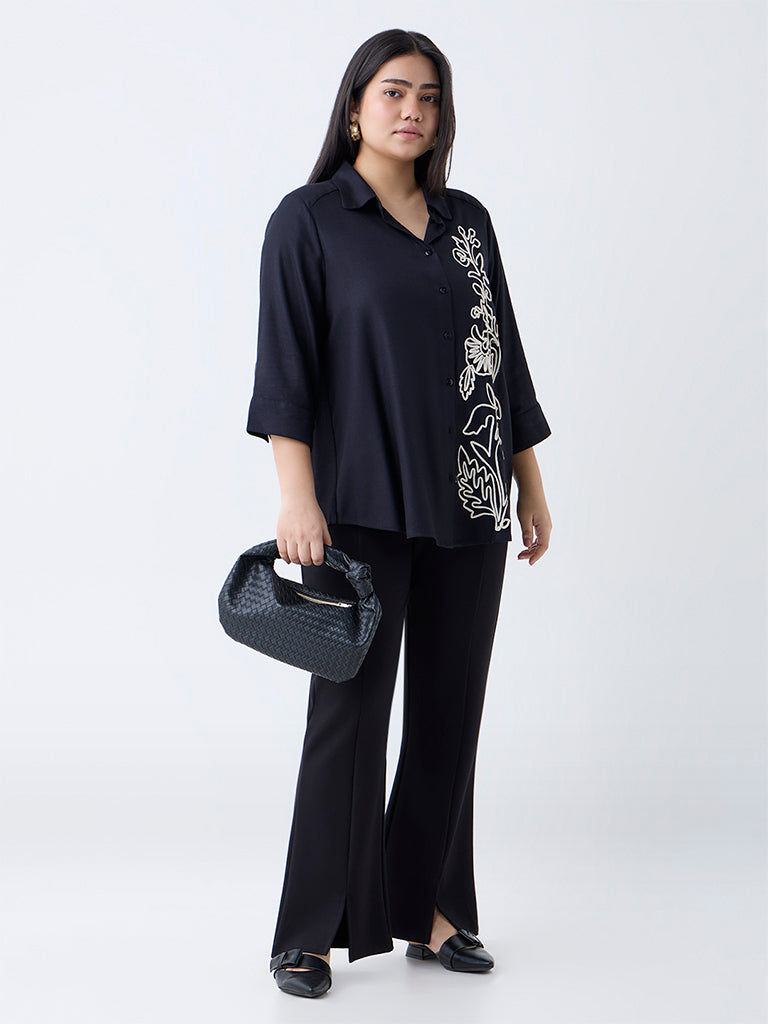 Elevate your wardrobe with this black shirt from Gia, beautifully accented with delicate floral embroidery. Designed with a chic notched collar that flows into a button-down front and three-quarter sleeves, it combines timeless elegance with modern sophistication.