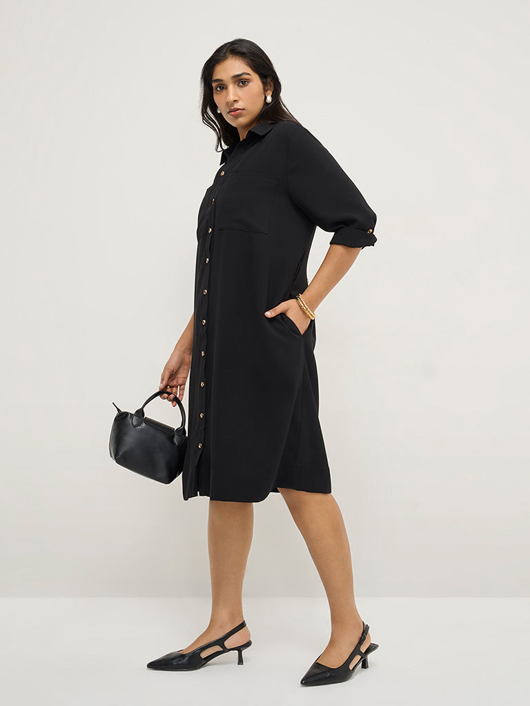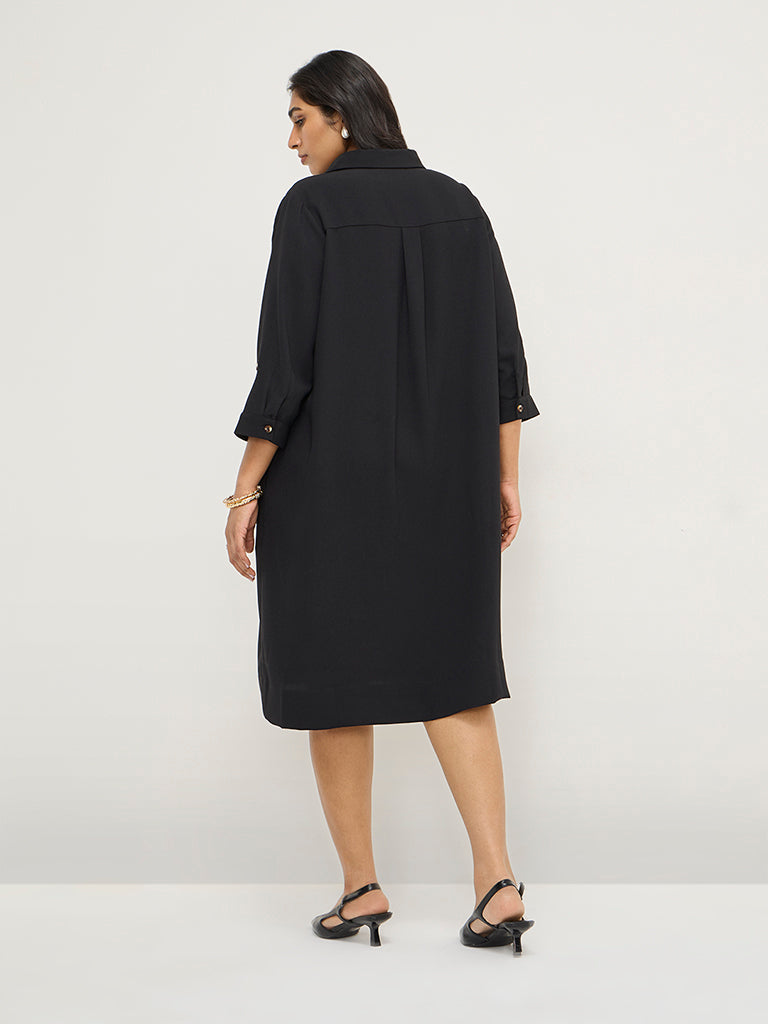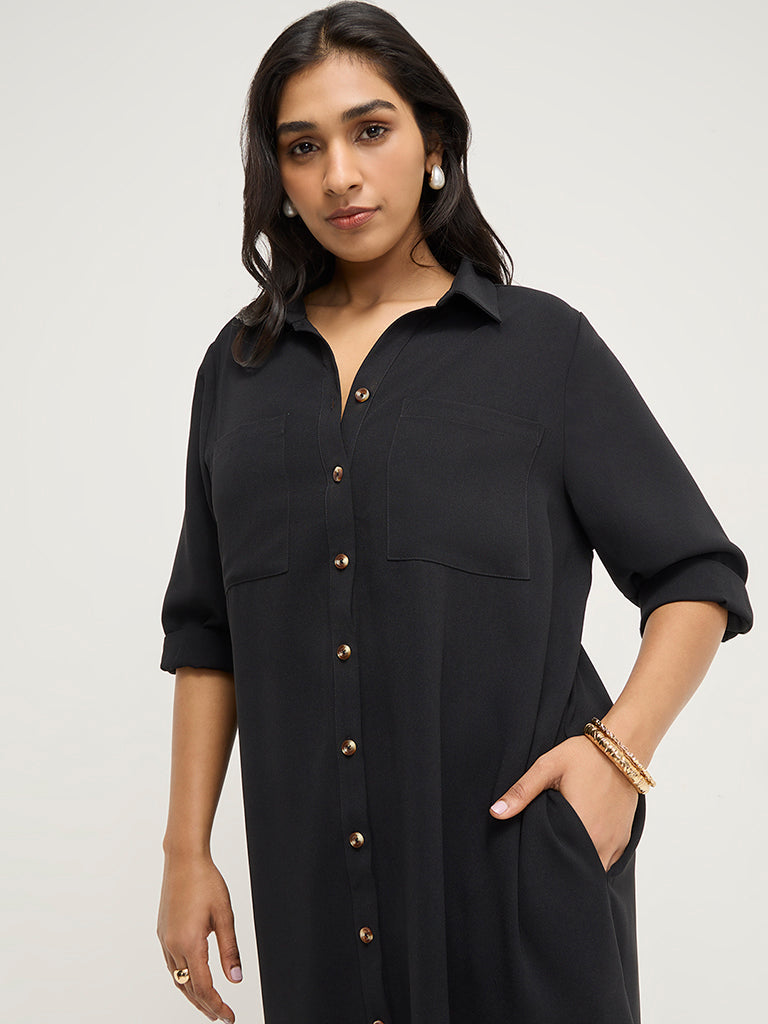 This black dress by Gia is presented in a chic high-low silhouette. Made with quality fabric, it boasts a notched collar, button down front, 3/4th sleeves and two front and side pockets. The complimentary belt brings this outfit together.