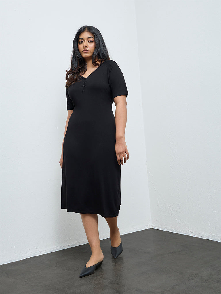 Gia presents this black dress crafted from premium fabric for a soft, comfortable feel. Featuring a refined V-neckline with a sleek quarter button placket and short sleeves, it showcases a graceful A-line silhouette that offers relaxed vibes.