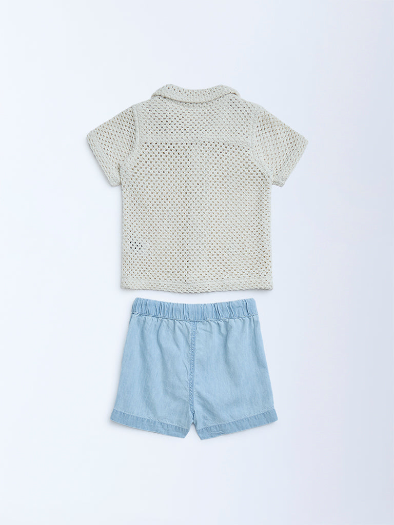 Make a stylish statement with this beige co-ord set from HOP Baby, thoughtfully designed for little explorers. The pure cotton crochet-knit shirt showcases intricate animal embroidery along with a camp collar, short sleeves and a button placket. It’s paired with denim shorts finished with an elasticated waistband and attached drawstrings for easy comfort.