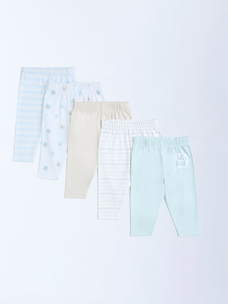 HOP Baby introduces this set of five mid-rise multicolour pants, crafted from soft cotton fabric to keep your little one comfortable through the day. The pack includes a beige chevron print, a blue striped design, a solid pink, a light blue solid and a white pair patterned with playful bear motifs. Designed with an elasticated waist, these pants ensure a gentle yet secure fit.