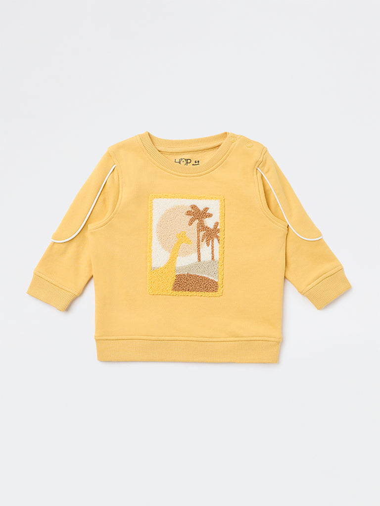 A cheerful addition to everyday layers, this yellow sweatshirt from HOP Baby brings a playful yet cosy appeal. Exhibiting a vibrant nature-inspired embroidery, it features a crew neck, full sleeves accented with subtle piping details and ribbed detailing at the neck, cuffs and hem ensuring a neat finish. Woven from a cotton-blend fabric, this sweatshirt is well suited for comfortable wear through cooler days.